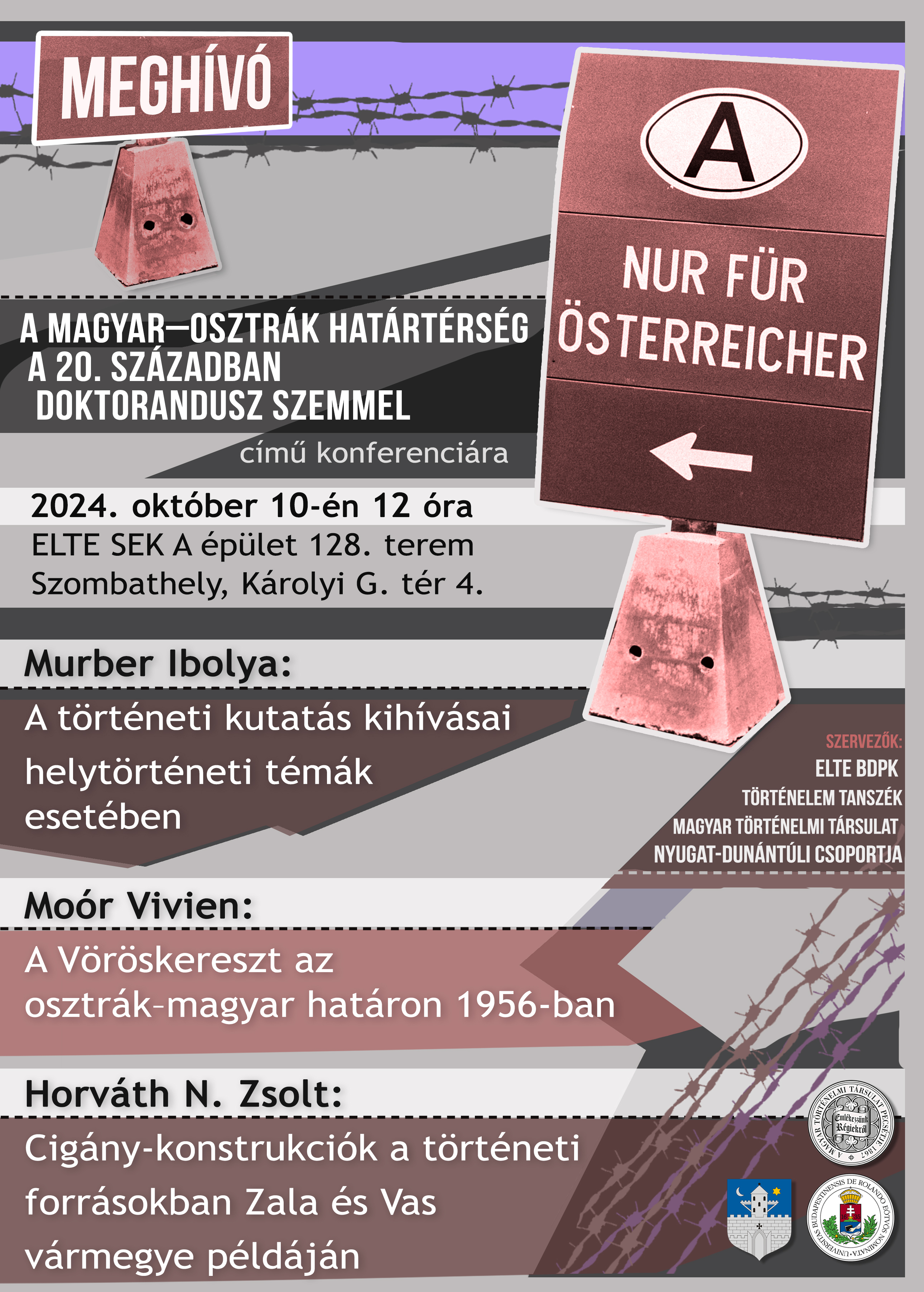 Az ELTE BDPK Történelem Tanszék és a Magyar Történelmi Társulat Nyugat-Dunántúli Csoportja tisztelettel vár minden érdeklődőt A magyar–osztrák határtérség a 20. században doktorandusz szemmel című konferenciájára.